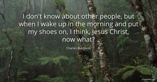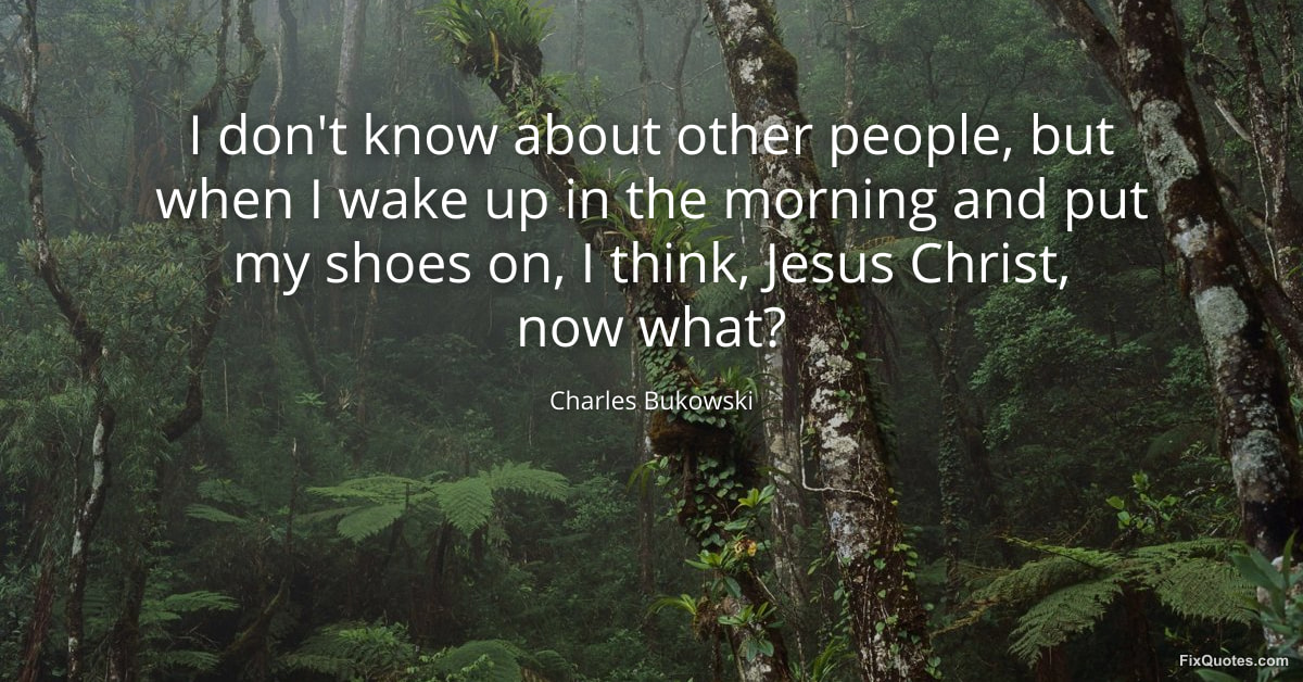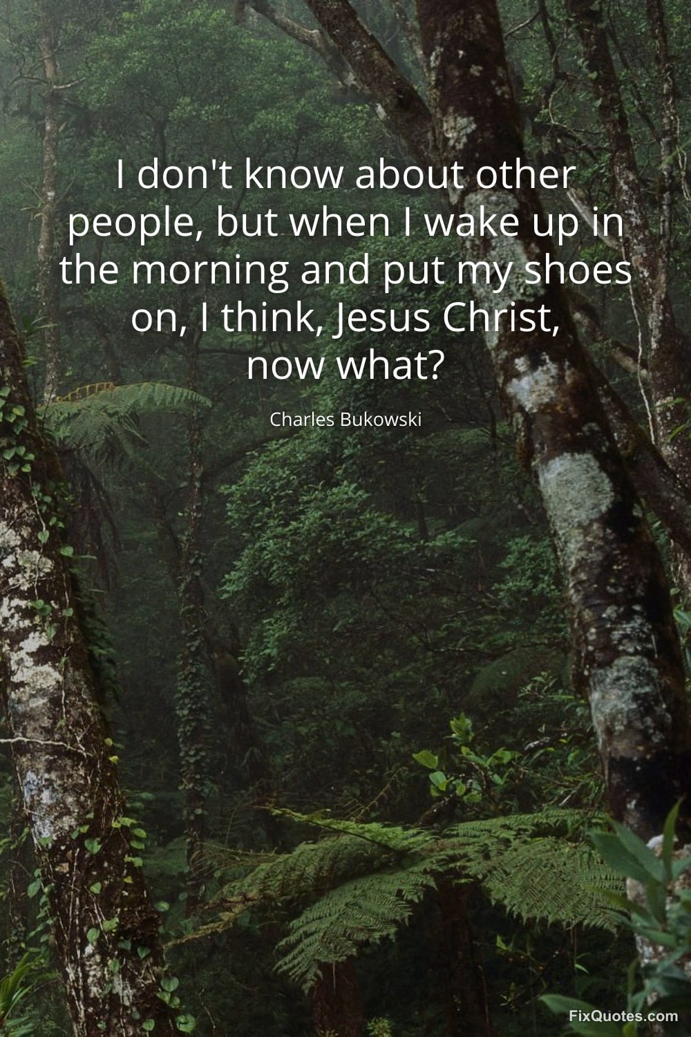 Bukowski, Charles. (2026, February 10). I don't know about other people, but when I wake up in the morning and put my shoes on, I think, Jesus Christ, now what? FixQuotes. https://fixquotes.com/quotes/i-dont-know-about-other-people-but-when-i-wake-up-185205/