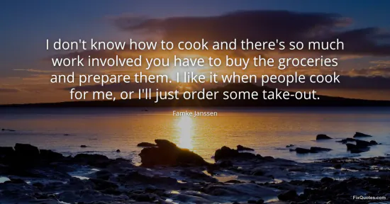 Janssen, Famke. (2026, January 15). I don't know how to cook and there's so much work involved you have to buy the groceries and prepare them. I like it when people cook for me, or I'll just order some take-out. FixQuotes. https://fixquotes.com/quotes/i-dont-know-how-to-cook-and-theres-so-much-work-140656/
