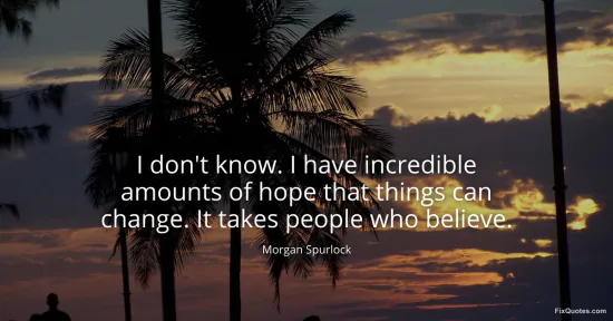 Spurlock, Morgan. (2026, January 16). I don't know. I have incredible amounts of hope that things can change. It takes people who believe. FixQuotes. https://fixquotes.com/quotes/i-dont-know-i-have-incredible-amounts-of-hope-93477/