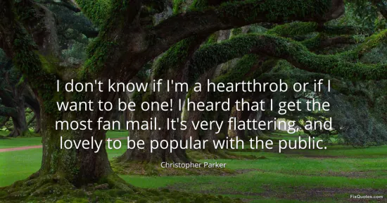 Parker, Christopher. "I don't know if I'm a heartthrob or if I want to be one! I heard that I get the most fan mail. It's very flattering, and lovely to be popular with the public." FixQuotes. January 15, 2026. https://fixquotes.com/quotes/i-dont-know-if-im-a-heartthrob-or-if-i-want-to-be-160146/.