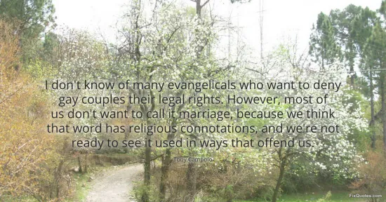 Campolo, Tony. "I don't know of many evangelicals who want to deny gay couples their legal rights. However, most of us don't want to call it marriage, because we think that word has religious connotations, and we're not ready to see it used in ways that offend us." FixQuotes. January 16, 2026. https://fixquotes.com/quotes/i-dont-know-of-many-evangelicals-who-want-to-deny-122047/.