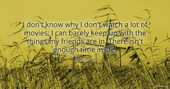 Streep, Meryl. (2026, January 17). I don't know why I don't watch a lot of movies; I can barely keep up with the things my friends are in. There isn't enough time in life. FixQuotes. https://fixquotes.com/quotes/i-dont-know-why-i-dont-watch-a-lot-of-movies-i-26339/