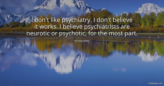 Alley, Kirstie. (2026, January 16). I don't like psychiatry. I don't believe it works. I believe psychiatrists are neurotic or psychotic, for the most part. FixQuotes. https://fixquotes.com/quotes/i-dont-like-psychiatry-i-dont-believe-it-works-i-118930/