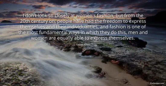 Ando, Tadao. "I don't look so closely at women's fashion, but from the 20th century on, people have had the freedom to express themselves and their individualities, and fashion is one of the most fundamental ways in which they do this, men and women are equally able to express themselves." FixQuotes. January 17, 2026. https://fixquotes.com/quotes/i-dont-look-so-closely-at-womens-fashion-but-from-78648/.