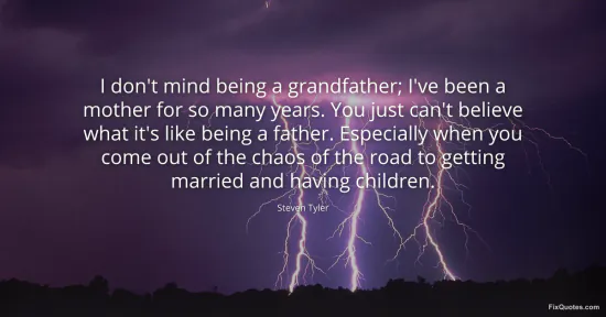 Tyler, Steven. "I don't mind being a grandfather; I've been a mother for so many years. You just can't believe what it's like being a father. Especially when you come out of the chaos of the road to getting married and having children." FixQuotes. January 18, 2026. https://fixquotes.com/quotes/i-dont-mind-being-a-grandfather-ive-been-a-mother-1911/.