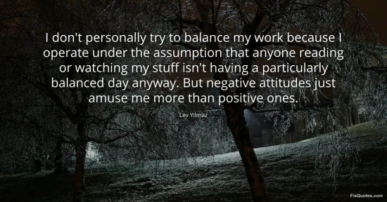 Yilmaz, Lev. "I don't personally try to balance my work because I operate under the assumption that anyone reading or watching my stuff isn't having a particularly balanced day anyway. But negative attitudes just amuse me more than positive ones." FixQuotes. January 16, 2026. https://fixquotes.com/quotes/i-dont-personally-try-to-balance-my-work-because-104267/.