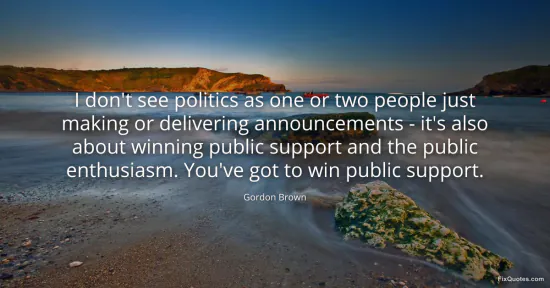 Brown, Gordon. "I don't see politics as one or two people just making or delivering announcements - it's also about winning public support and the public enthusiasm. You've got to win public support." FixQuotes. January 15, 2026. https://fixquotes.com/quotes/i-dont-see-politics-as-one-or-two-people-just-146115/.