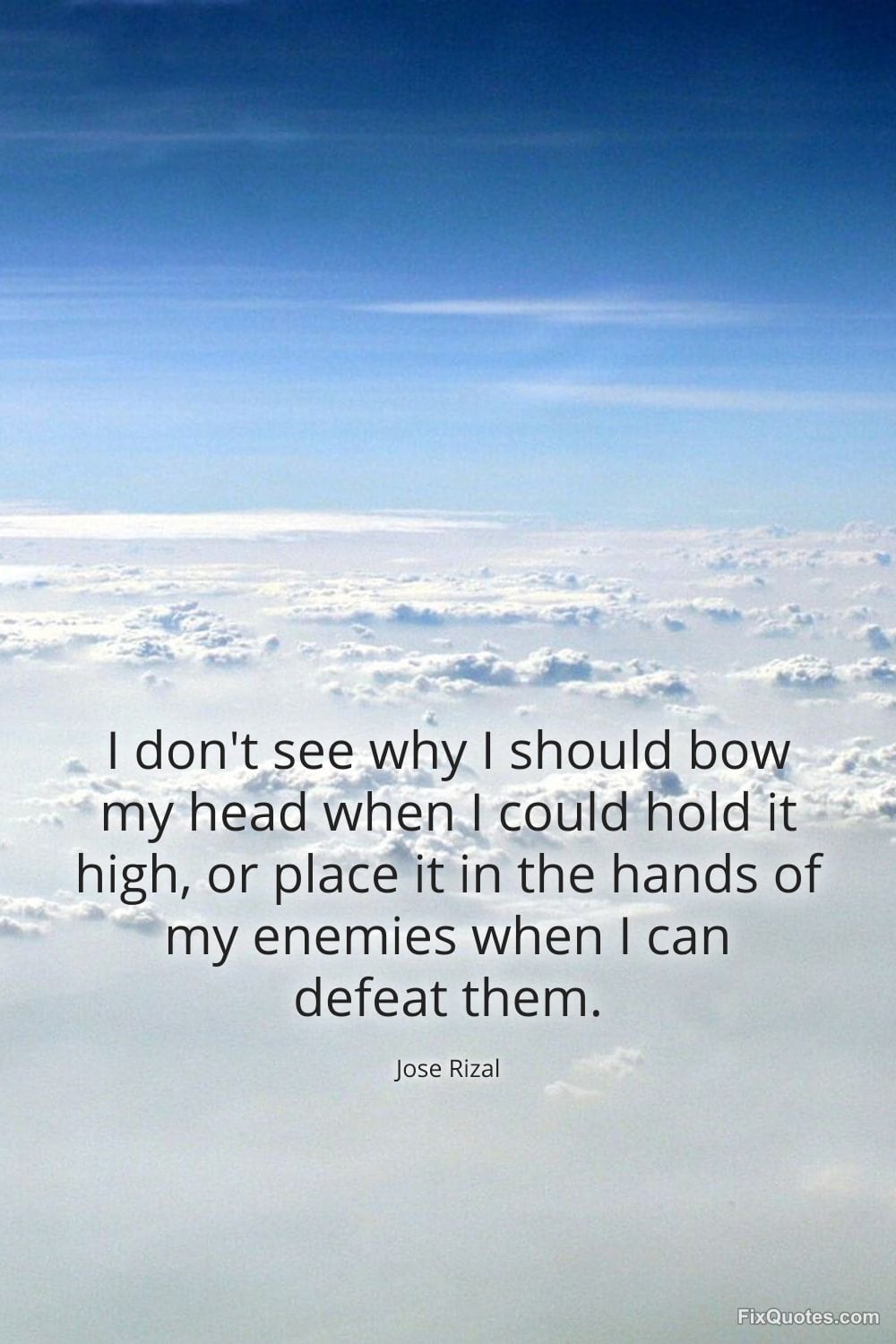 Rizal, Jose. "I don't see why I should bow my head when I could hold it high, or place it in the hands of my enemies when I can defeat them." FixQuotes. February 10, 2026. https://fixquotes.com/quotes/i-dont-see-why-i-should-bow-my-head-when-i-could-185076/.