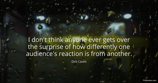 Cavett, Dick. (2026, January 18). I don't think anyone ever gets over the surprise of how differently one audience's reaction is from another. FixQuotes. https://fixquotes.com/quotes/i-dont-think-anyone-ever-gets-over-the-surprise-19171/