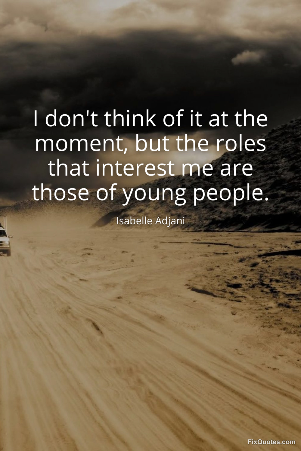 Adjani, Isabelle. (2026, January 17). I don't think of it at the moment, but the roles that interest me are those of young people. FixQuotes. https://fixquotes.com/quotes/i-dont-think-of-it-at-the-moment-but-the-roles-79868/