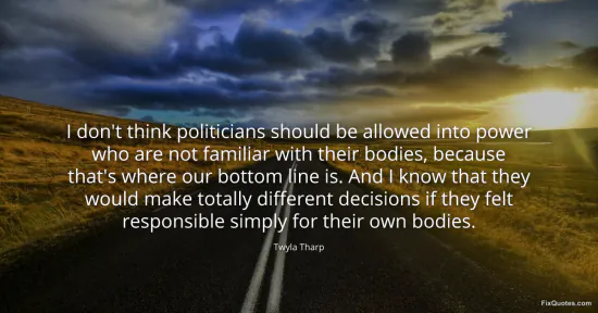 Tharp, Twyla. "I don't think politicians should be allowed into power who are not familiar with their bodies, because that's where our bottom line is. And I know that they would make totally different decisions if they felt responsible simply for their own bodies." FixQuotes. January 16, 2026. https://fixquotes.com/quotes/i-dont-think-politicians-should-be-allowed-into-99655/.