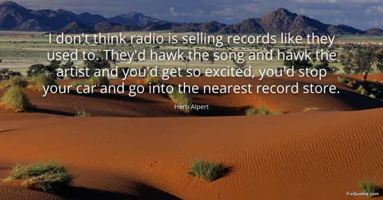 Alpert, Herb. "I don't think radio is selling records like they used to. They'd hawk the song and hawk the artist and you'd get so excited, you'd stop your car and go into the nearest record store." FixQuotes. January 15, 2026. https://fixquotes.com/quotes/i-dont-think-radio-is-selling-records-like-they-158421/.