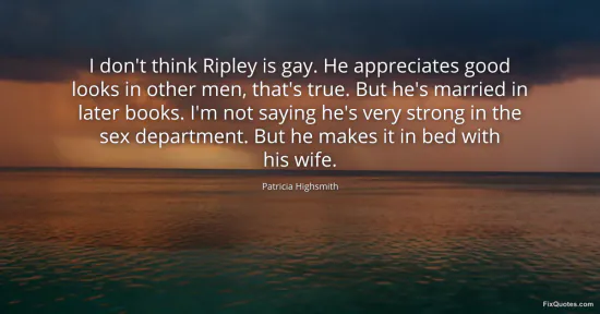 Highsmith, Patricia. (2026, January 16). I don't think Ripley is gay. He appreciates good looks in other men, that's true. But he's married in later books. I'm not saying he's very strong in the sex department. But he makes it in bed with his wife. FixQuotes. https://fixquotes.com/quotes/i-dont-think-ripley-is-gay-he-appreciates-good-128578/