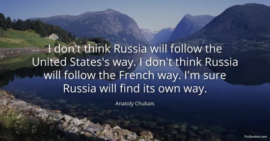 Chubais, Anatoly. "I don't think Russia will follow the United States's way. I don't think Russia will follow the French way. I'm sure Russia will find its own way." FixQuotes. January 15, 2026. https://fixquotes.com/quotes/i-dont-think-russia-will-follow-the-united-149769/.