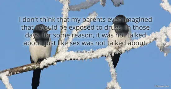 Cole, Natalie. "I don't think that my parents even imagined that I would be exposed to drugs. In those days, for some reason, it was not talked about, just like sex was not talked about." FixQuotes. January 16, 2026. https://fixquotes.com/quotes/i-dont-think-that-my-parents-even-imagined-that-i-127911/.