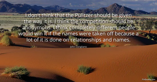 Corigliano, John. "I don't think that the Pulitzer should be given the way it is. I think the competition should be anonymous. I think completely different people would win it if the names were taken off because a lot of it is done on relationships and names." FixQuotes. January 17, 2026. https://fixquotes.com/quotes/i-dont-think-that-the-pulitzer-should-be-given-51303/.