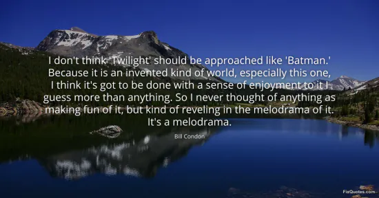 Condon, Bill. "I don't think 'Twilight' should be approached like 'Batman.' Because it is an invented kind of world, especially this one, I think it's got to be done with a sense of enjoyment to it I guess more than anything. So I never thought of anything as making fun of it, but kind of reveling in the melodrama of it. It's a melodrama." FixQuotes. Accessed February 2, 2026. https://fixquotes.com/quotes/i-dont-think-twilight-should-be-approached-like-184068/.