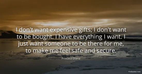 Diana, Princess. "I don't want expensive gifts; I don't want to be bought. I have everything I want. I just want someone to be there for me, to make me feel safe and secure." FixQuotes. January 18, 2026. https://fixquotes.com/quotes/i-dont-want-expensive-gifts-i-dont-want-to-be-1269/.