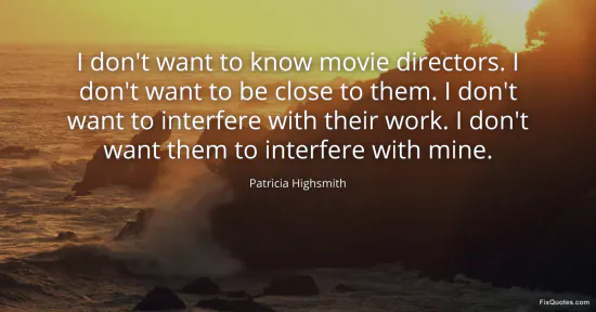 Highsmith, Patricia. "I don't want to know movie directors. I don't want to be close to them. I don't want to interfere with their work. I don't want them to interfere with mine." FixQuotes. January 15, 2026. https://fixquotes.com/quotes/i-dont-want-to-know-movie-directors-i-dont-want-168239/.