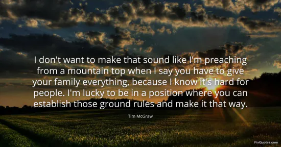 McGraw, Tim. "I don't want to make that sound like I'm preaching from a mountain top when I say you have to give your family everything, because I know it's hard for people. I'm lucky to be in a position where you can establish those ground rules and make it that way." FixQuotes. January 16, 2026. https://fixquotes.com/quotes/i-dont-want-to-make-that-sound-like-im-preaching-102699/.