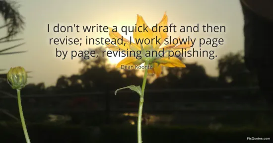 Koontz, Dean. "I don't write a quick draft and then revise; instead, I work slowly page by page, revising and polishing." FixQuotes. January 15, 2026. https://fixquotes.com/quotes/i-dont-write-a-quick-draft-and-then-revise-140505/.
