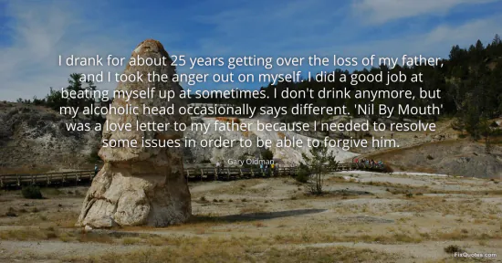 Oldman, Gary. (2026, February 20). I drank for about 25 years getting over the loss of my father, and I took the anger out on myself. I did a good job at beating myself up at sometimes. I don't drink anymore, but my alcoholic head occasionally says different. 'Nil By Mouth' was a love letter to my father because I needed to resolve some issues in order to be able to forgive him. FixQuotes. https://fixquotes.com/quotes/i-drank-for-about-25-years-getting-over-the-loss-18768/