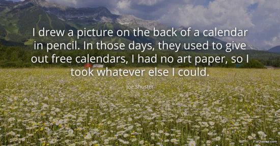 Shuster, Joe. "I drew a picture on the back of a calendar in pencil. In those days, they used to give out free calendars, I had no art paper, so I took whatever else I could." FixQuotes. February 16, 2026. https://fixquotes.com/quotes/i-drew-a-picture-on-the-back-of-a-calendar-in-142972/.