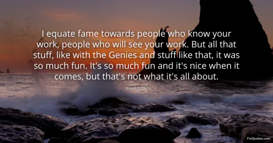Oh, Sandra. (2026, January 16). I equate fame towards people who know your work, people who will see your work. But all that stuff, like with the Genies and stuff like that, it was so much fun. It's so much fun and it's nice when it comes, but that's not what it's all about. FixQuotes. https://fixquotes.com/quotes/i-equate-fame-towards-people-who-know-your-work-116386/