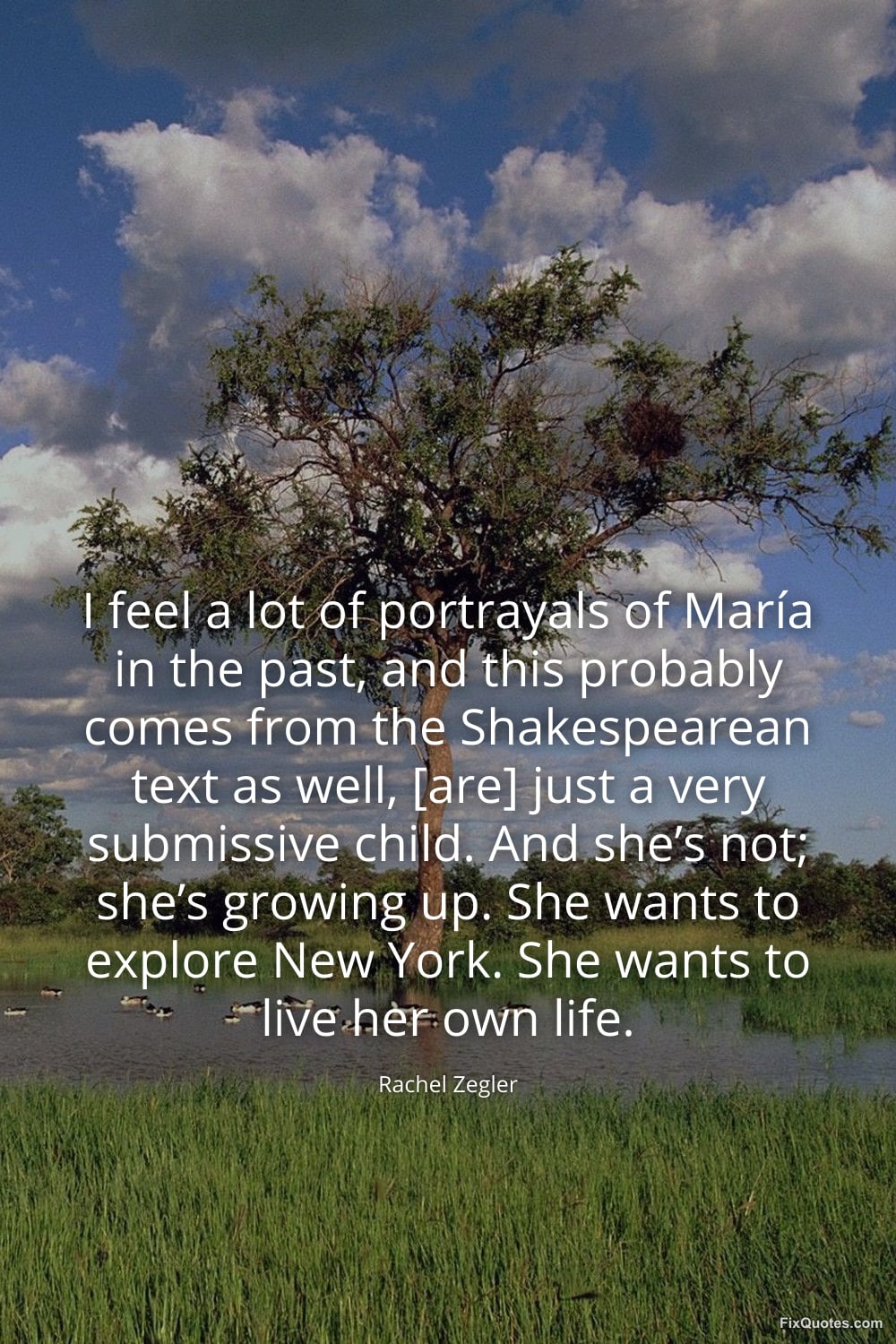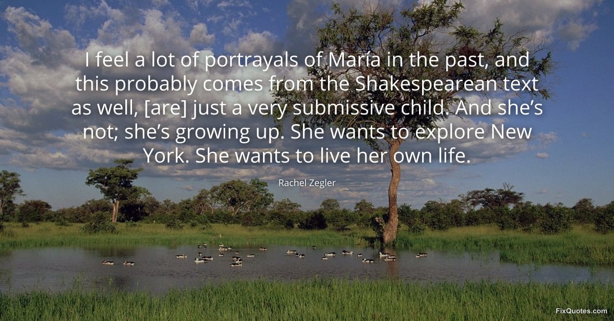 Zegler, Rachel. (2026, March 18). I feel a lot of portrayals of María in the past, and this probably comes from the Shakespearean text as well, [are] just a very submissive child. And she’s not; she’s growing up. She wants to explore New York. She wants to live her own life. FixQuotes. https://fixquotes.com/quotes/i-feel-a-lot-of-portrayals-of-maria-in-the-past-186151/