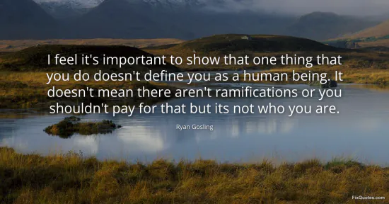 Gosling, Ryan. (2026, January 17). I feel it's important to show that one thing that you do doesn't define you as a human being. It doesn't mean there aren't ramifications or you shouldn't pay for that but its not who you are. FixQuotes. https://fixquotes.com/quotes/i-feel-its-important-to-show-that-one-thing-that-73601/