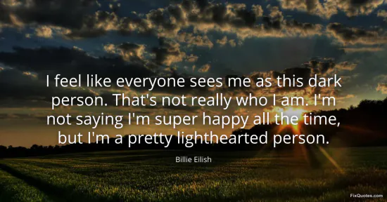 Eilish, Billie. "I feel like everyone sees me as this dark person. That's not really who I am. I'm not saying I'm super happy all the time, but I'm a pretty lighthearted person." FixQuotes. January 15, 2026. https://fixquotes.com/quotes/i-feel-like-everyone-sees-me-as-this-dark-person-172072/.