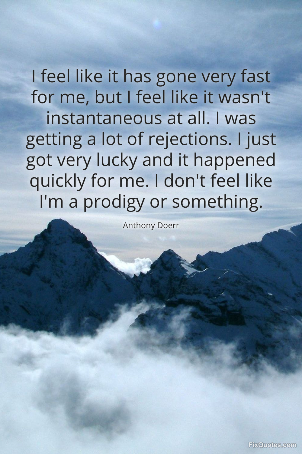 Doerr, Anthony. (2026, February 17). I feel like it has gone very fast for me, but I feel like it wasn't instantaneous at all. I was getting a lot of rejections. I just got very lucky and it happened quickly for me. I don't feel like I'm a prodigy or something. FixQuotes. https://fixquotes.com/quotes/i-feel-like-it-has-gone-very-fast-for-me-but-i-110836/