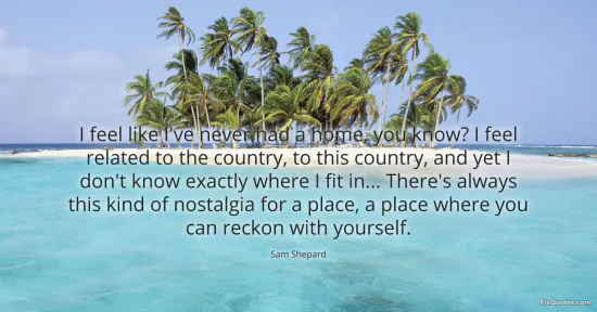 Shepard, Sam. (2026, January 15). I feel like I've never had a home, you know? I feel related to the country, to this country, and yet I don't know exactly where I fit in... There's always this kind of nostalgia for a place, a place where you can reckon with yourself. FixQuotes. https://fixquotes.com/quotes/i-feel-like-ive-never-had-a-home-you-know-i-feel-137311/