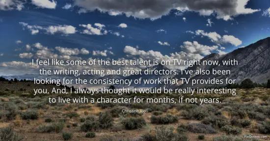 Ricci, Christina. (2026, January 17). I feel like some of the best talent is on TV right now, with the writing, acting and great directors. I've also been looking for the consistency of work that TV provides for you. And, I always thought it would be really interesting to live with a character for months, if not years. FixQuotes. https://fixquotes.com/quotes/i-feel-like-some-of-the-best-talent-is-on-tv-67175/