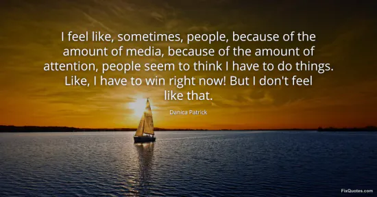 Patrick, Danica. "I feel like, sometimes, people, because of the amount of media, because of the amount of attention, people seem to think I have to do things. Like, I have to win right now! But I don't feel like that." FixQuotes. January 17, 2026. https://fixquotes.com/quotes/i-feel-like-sometimes-people-because-of-the-49429/.