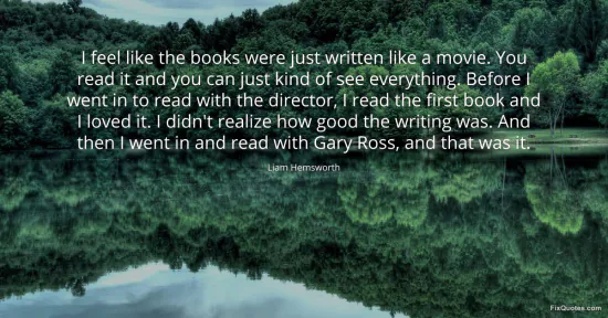 Hemsworth, Liam. (2026, January 15). I feel like the books were just written like a movie. You read it and you can just kind of see everything. Before I went in to read with the director, I read the first book and I loved it. I didn't realize how good the writing was. And then I went in and read with Gary Ross, and that was it. FixQuotes. https://fixquotes.com/quotes/i-feel-like-the-books-were-just-written-like-a-172479/