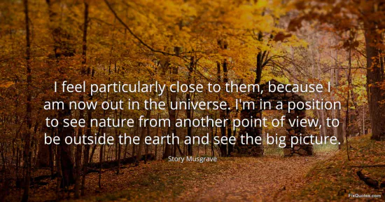 Musgrave, Story. "I feel particularly close to them, because I am now out in the universe. I'm in a position to see nature from another point of view, to be outside the earth and see the big picture." FixQuotes. January 16, 2026. https://fixquotes.com/quotes/i-feel-particularly-close-to-them-because-i-am-97965/.