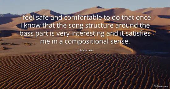 Lee, Geddy. "I feel safe and comfortable to do that once I know that the song structure around the bass part is very interesting and it satisfies me in a compositional sense." FixQuotes. January 17, 2026. https://fixquotes.com/quotes/i-feel-safe-and-comfortable-to-do-that-once-i-63219/.
