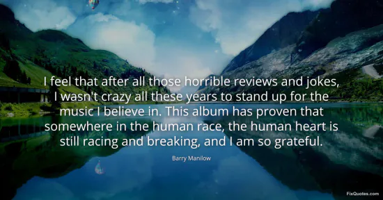 Manilow, Barry. "I feel that after all those horrible reviews and jokes, I wasn't crazy all these years to stand up for the music I believe in. This album has proven that somewhere in the human race, the human heart is still racing and breaking, and I am so grateful." FixQuotes. February 19, 2026. https://fixquotes.com/quotes/i-feel-that-after-all-those-horrible-reviews-and-37029/.