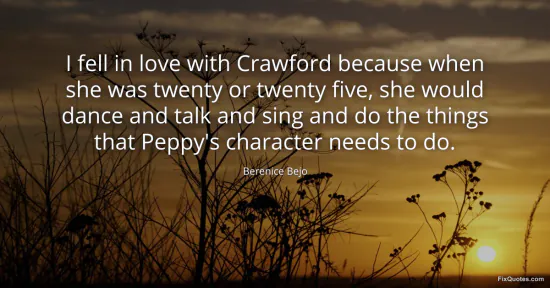 Bejo, Berenice. (2026, January 17). I fell in love with Crawford because when she was twenty or twenty five, she would dance and talk and sing and do the things that Peppy's character needs to do. FixQuotes. https://fixquotes.com/quotes/i-fell-in-love-with-crawford-because-when-she-was-37907/