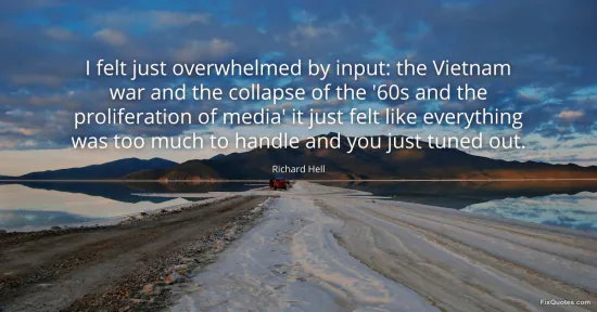 Hell, Richard. "I felt just overwhelmed by input: the Vietnam war and the collapse of the '60s and the proliferation of media' it just felt like everything was too much to handle and you just tuned out." FixQuotes. January 16, 2026. https://fixquotes.com/quotes/i-felt-just-overwhelmed-by-input-the-vietnam-war-115964/.