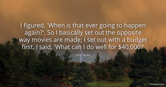 Sayles, John. (2026, January 17). I figured, 'When is that ever going to happen again?'. So I basically set out the opposite way movies are made; I set out with a budget first. I said, 'What can I do well for $40,000?'. FixQuotes. https://fixquotes.com/quotes/i-figured-when-is-that-ever-going-to-happen-again-60033/