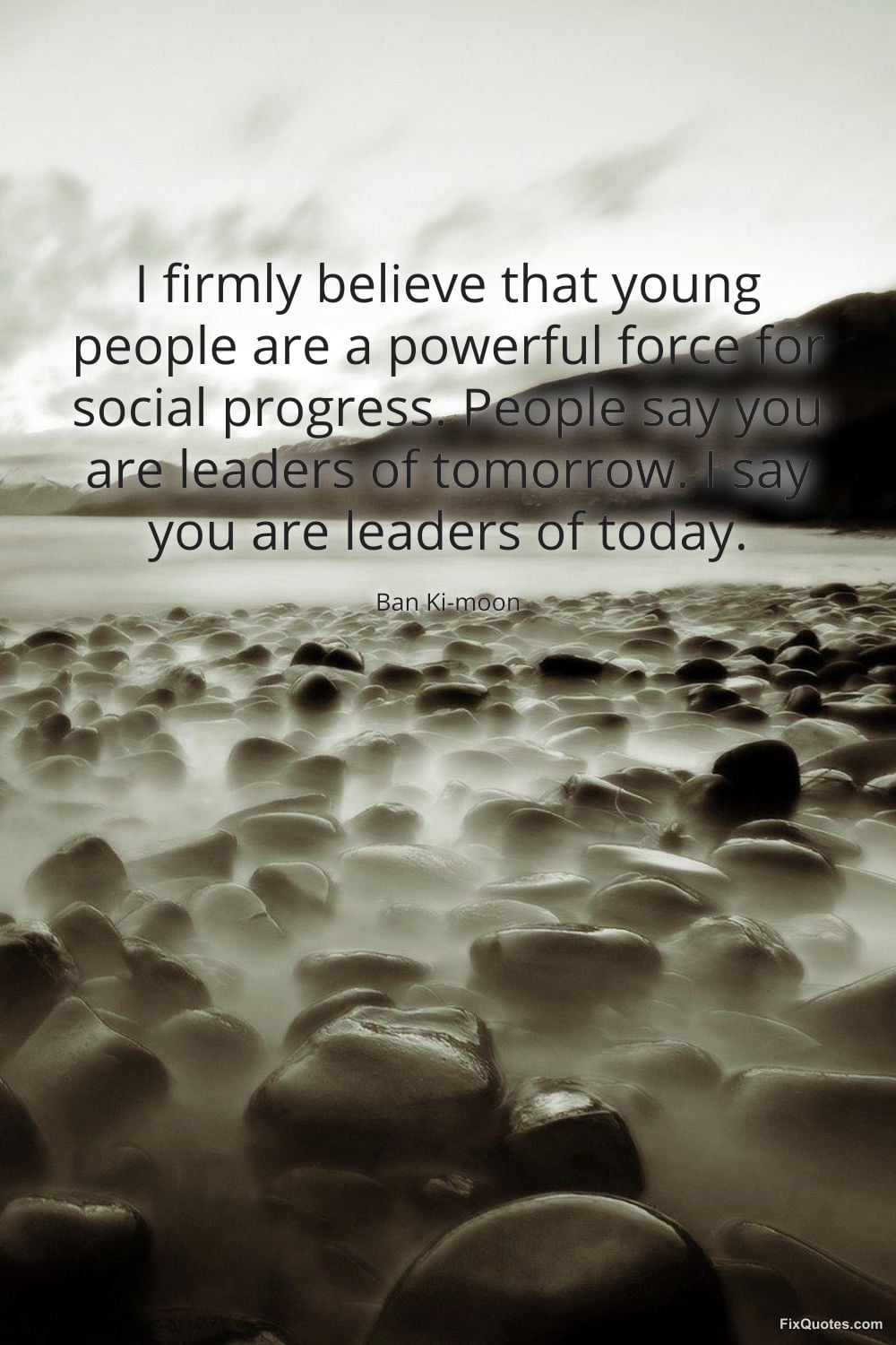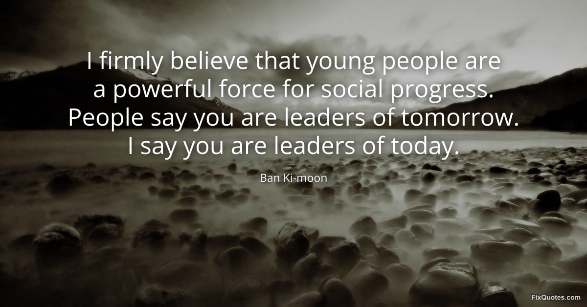 Ki-moon, Ban. "I firmly believe that young people are a powerful force for social progress. People say you are leaders of tomorrow. I say you are leaders of today." FixQuotes. March 8, 2026. https://fixquotes.com/quotes/i-firmly-believe-that-young-people-are-a-powerful-185751/.