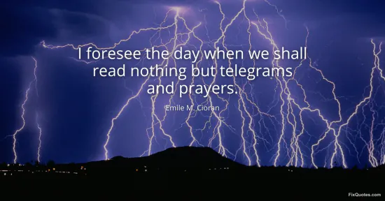 Cioran, Emile M. (2026, January 15). I foresee the day when we shall read nothing but telegrams and prayers. FixQuotes. https://fixquotes.com/quotes/i-foresee-the-day-when-we-shall-read-nothing-but-141497/