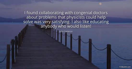 Cameron, John. (2026, January 17). I found collaborating with congenial doctors about problems that physicists could help solve was very satisfying. I also like educating anybody who would listen! FixQuotes. https://fixquotes.com/quotes/i-found-collaborating-with-congenial-doctors-57041/