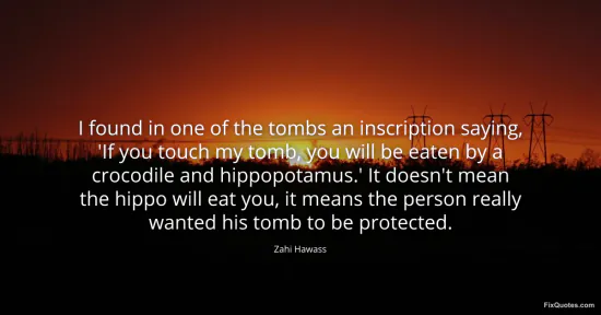 Hawass, Zahi. (2026, January 16). I found in one of the tombs an inscription saying, 'If you touch my tomb, you will be eaten by a crocodile and hippopotamus.' It doesn't mean the hippo will eat you, it means the person really wanted his tomb to be protected. FixQuotes. https://fixquotes.com/quotes/i-found-in-one-of-the-tombs-an-inscription-saying-114063/