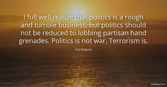 Roberts, Pat. (2026, January 15). I full well realize that politics is a rough and tumble business, but politics should not be reduced to lobbing partisan hand grenades. Politics is not war. Terrorism is. FixQuotes. https://fixquotes.com/quotes/i-full-well-realize-that-politics-is-a-rough-and-153959/
