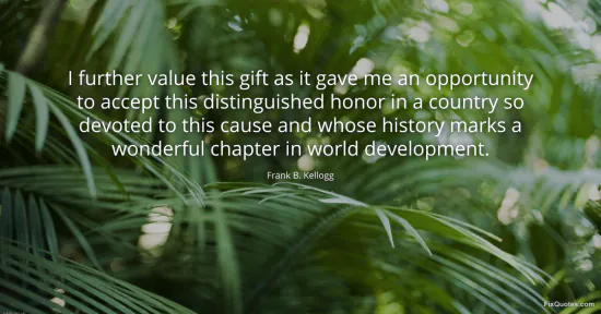 Kellogg, Frank B. "I further value this gift as it gave me an opportunity to accept this distinguished honor in a country so devoted to this cause and whose history marks a wonderful chapter in world development." FixQuotes. January 17, 2026. https://fixquotes.com/quotes/i-further-value-this-gift-as-it-gave-me-an-58391/.