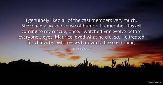 Stowe, Madeleine. "I genuinely liked all of the cast members very much. Steve had a wicked sense of humor. I remember Russell coming to my rescue, once. I watched Eric evolve before everyone's eyes. Maurice loved what he did, so. He treated his character with respect, down to the costuming." FixQuotes. January 16, 2026. https://fixquotes.com/quotes/i-genuinely-liked-all-of-the-cast-members-very-96451/.