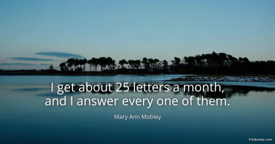 Mobley, Mary Ann. (2026, January 15). I get about 25 letters a month, and I answer every one of them. FixQuotes. https://fixquotes.com/quotes/i-get-about-25-letters-a-month-and-i-answer-every-158449/